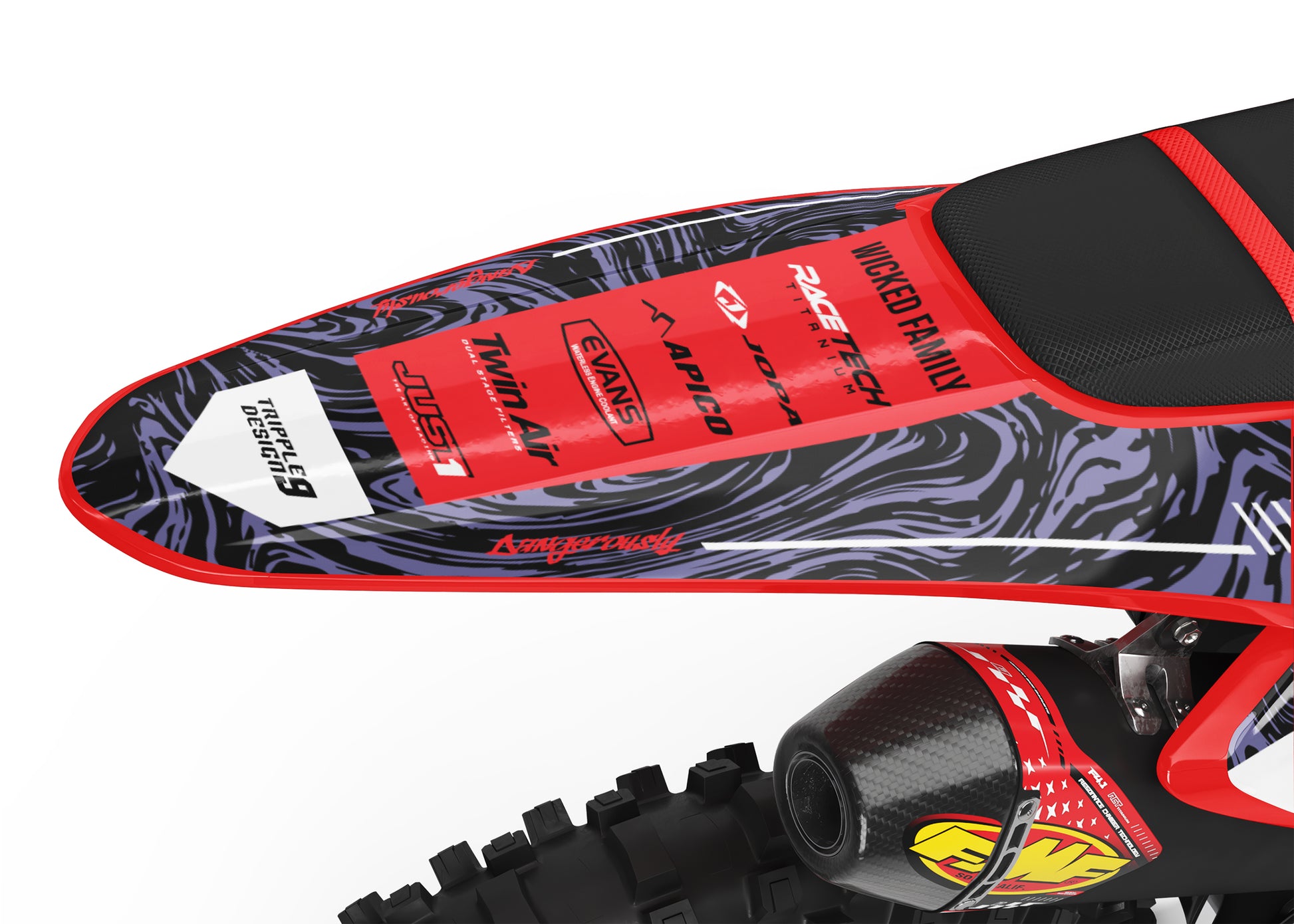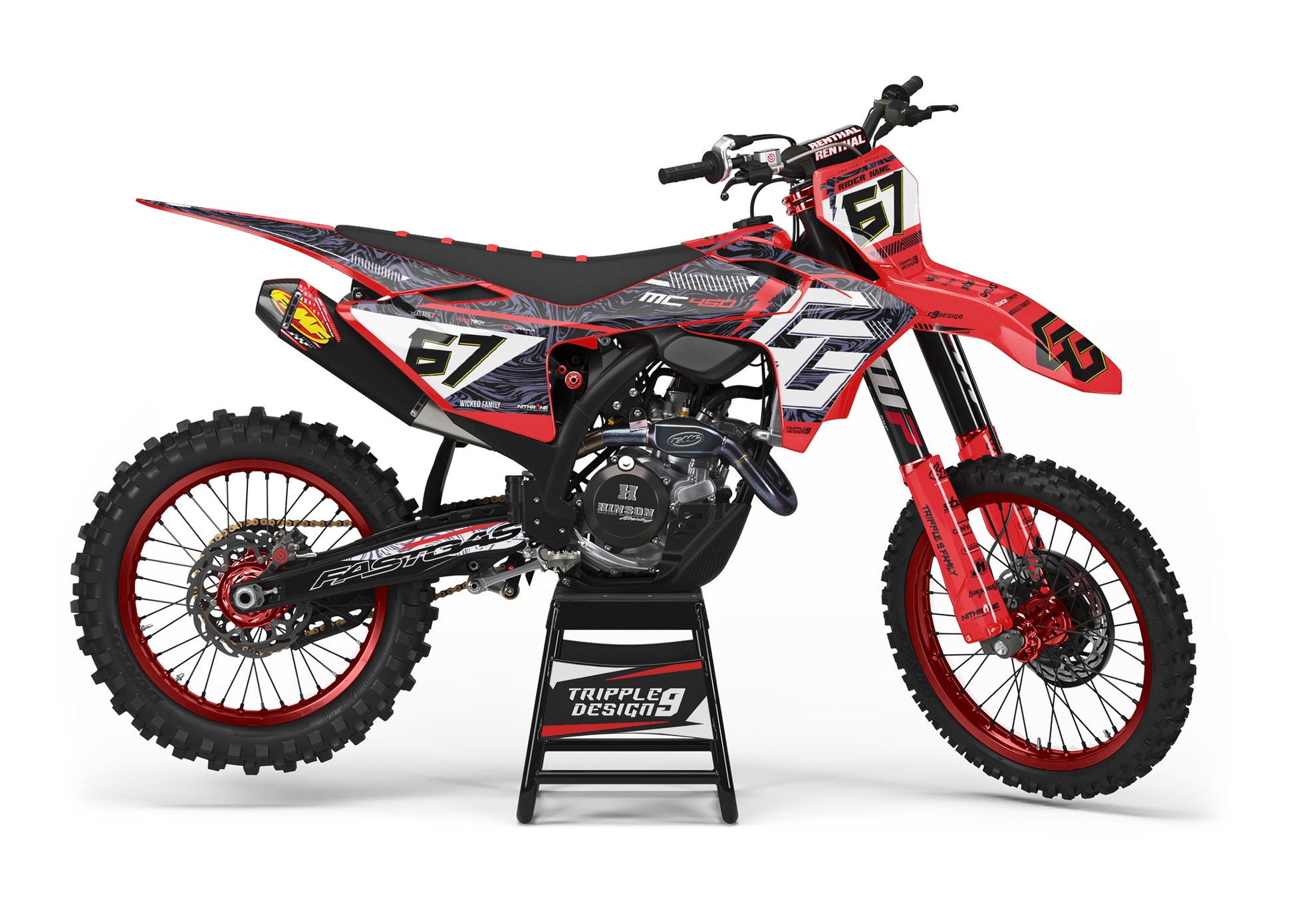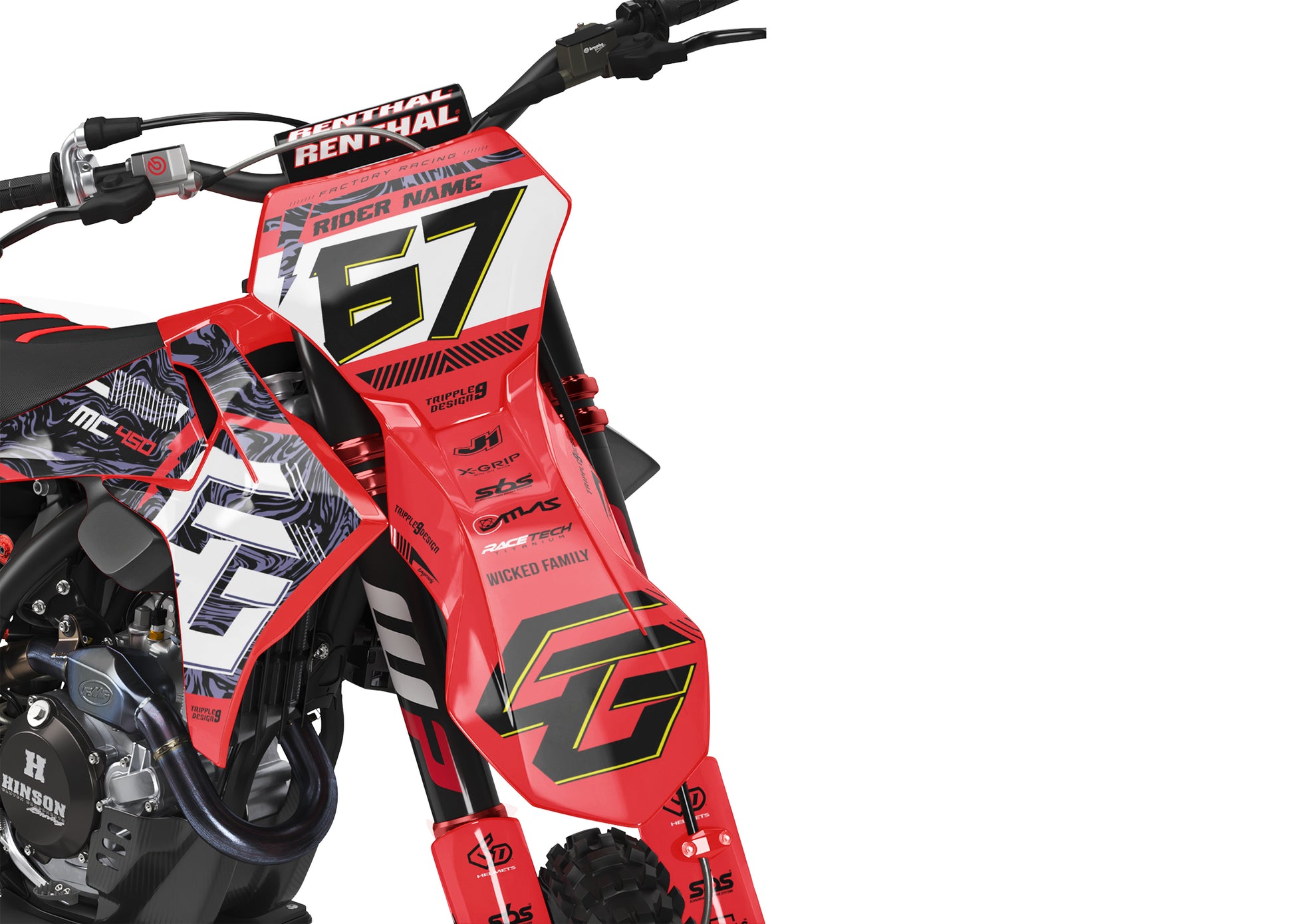 -Pełen zestaw personalizowanych oklein obejmuje naklejki na - osłony chłodnicy, Airbox, błotniki przód oraz tył, pola numerowe boczne oraz przednie, osłony lag oraz Wahacz (Skład może się różnić w zależności od modelu motocykla).
