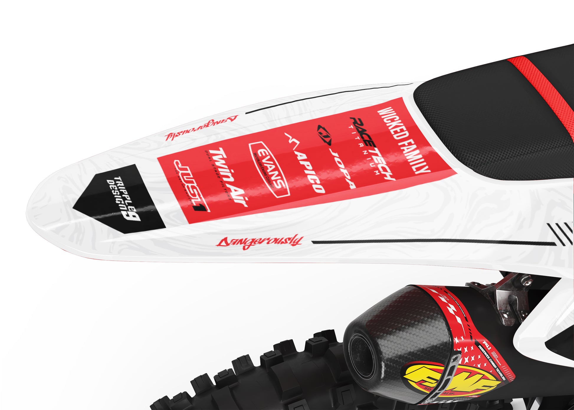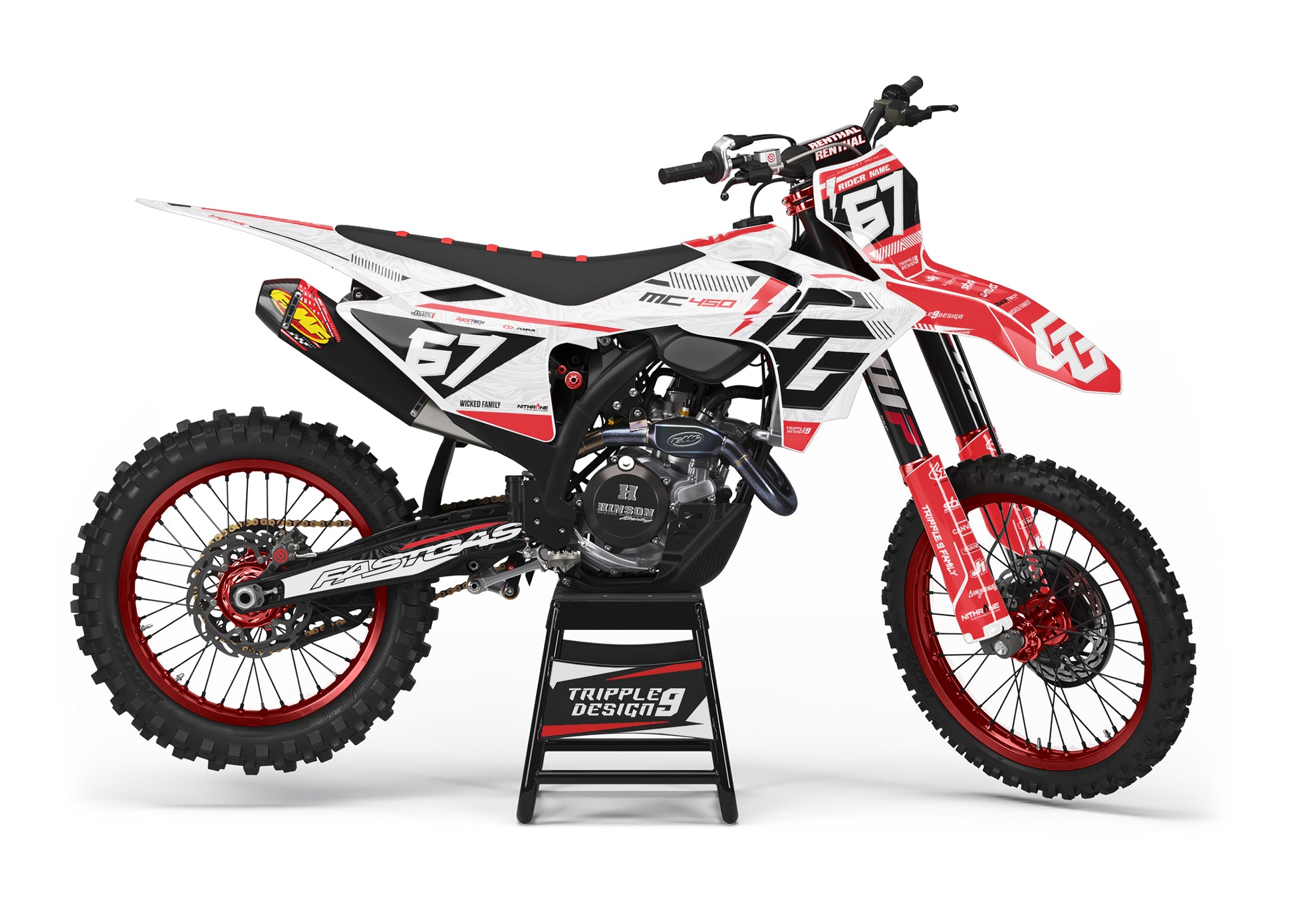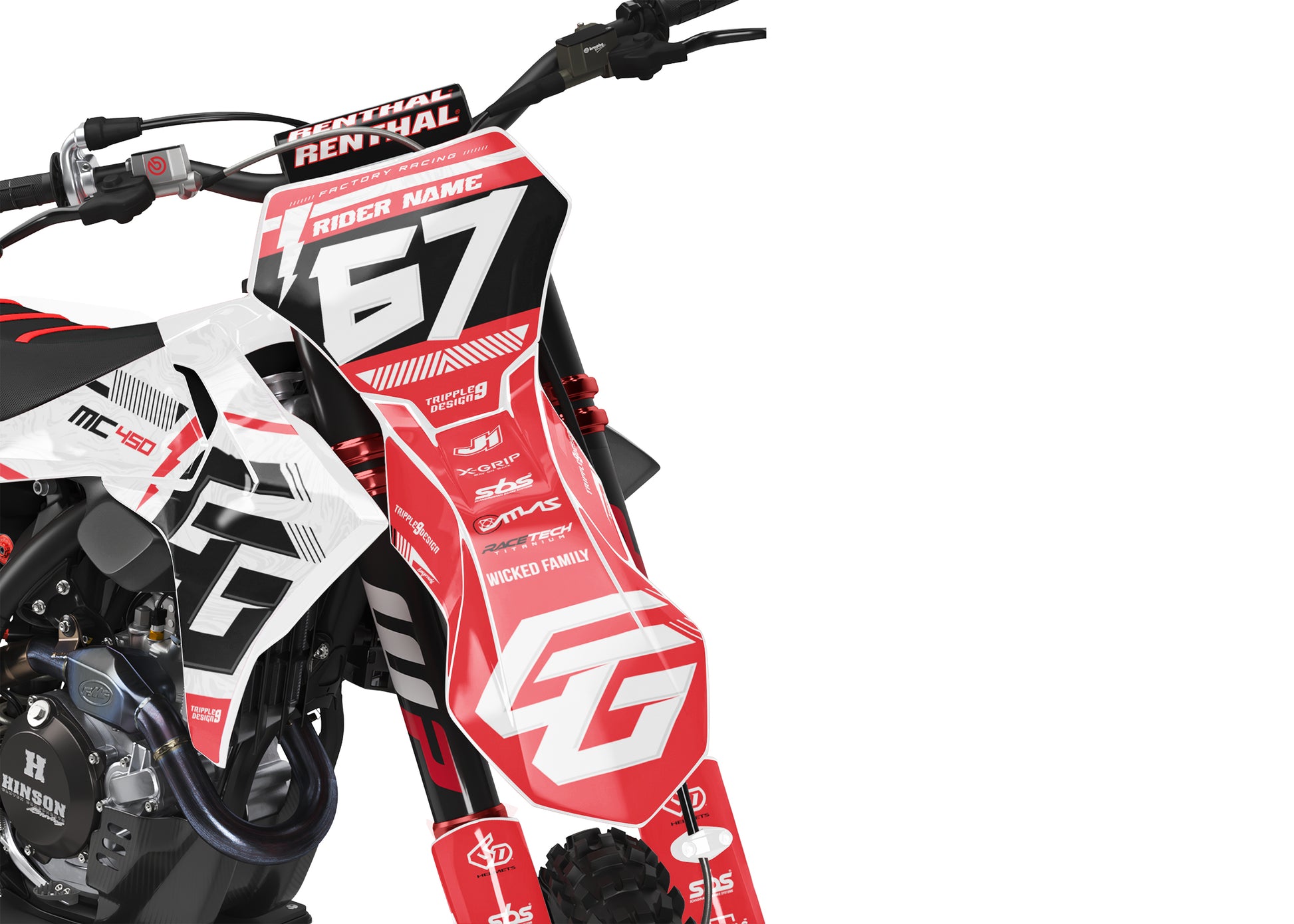-Pełen zestaw personalizowanych oklein obejmuje naklejki na - osłony chłodnicy, Airbox, błotniki przód oraz tył, pola numerowe boczne oraz przednie, osłony lag oraz Wahacz (Skład może się różnić w zależności od modelu motocykla).