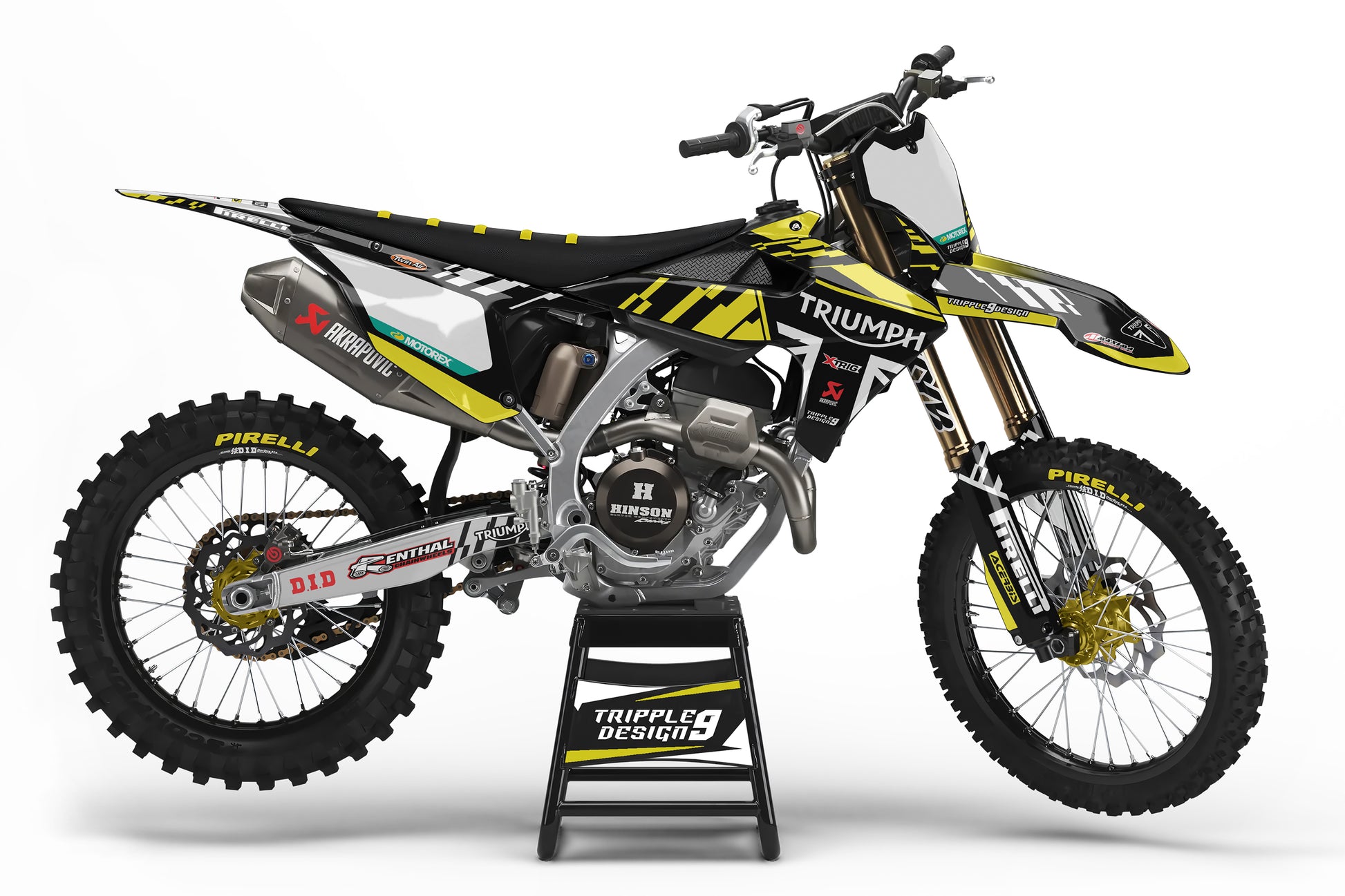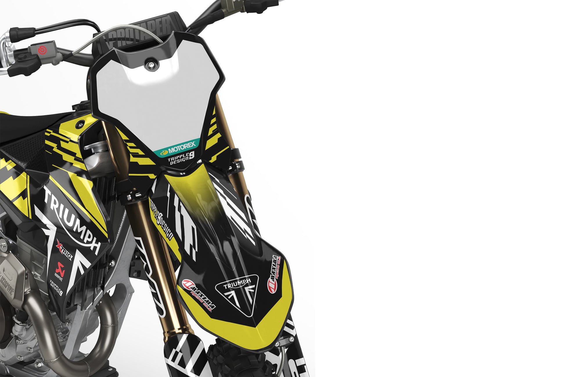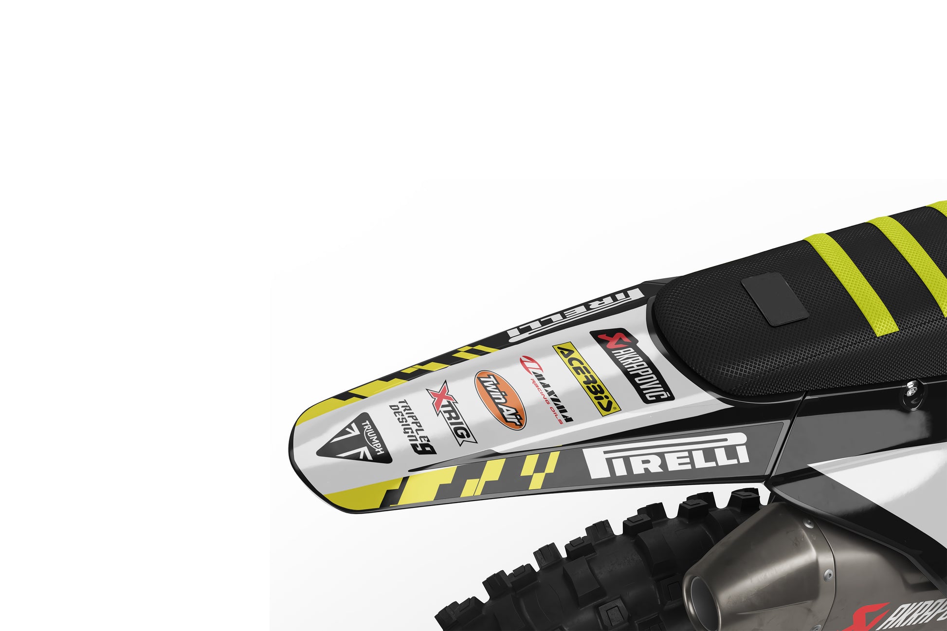 -Pełen zestaw personalizowanych oklein obejmuje naklejki na - osłony chłodnicy, Airbox, błotniki przód oraz tył, pola numerowe boczne oraz przednie, osłony lag oraz Wahacz (Skład może się różnić w zależności od modelu motocykla).